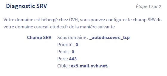J'ai mis le SRV du DNS du nom de domaine égal à celui du SRV d'exchange. C'est à dire : ex5.mail.ovh.net.