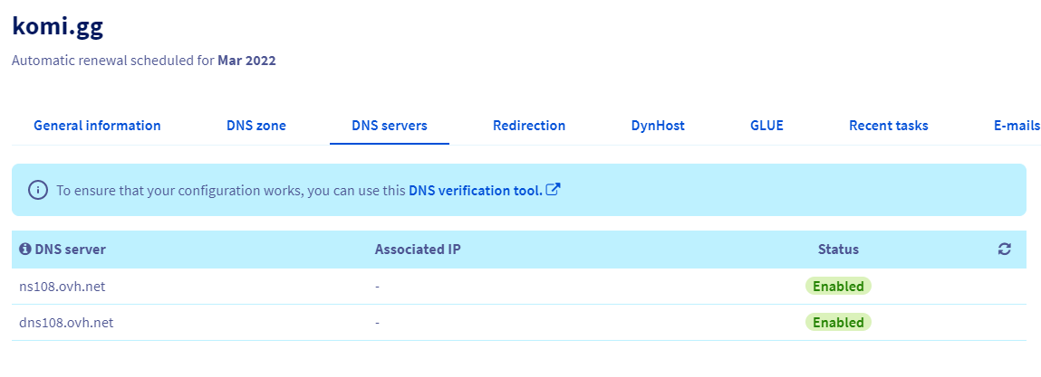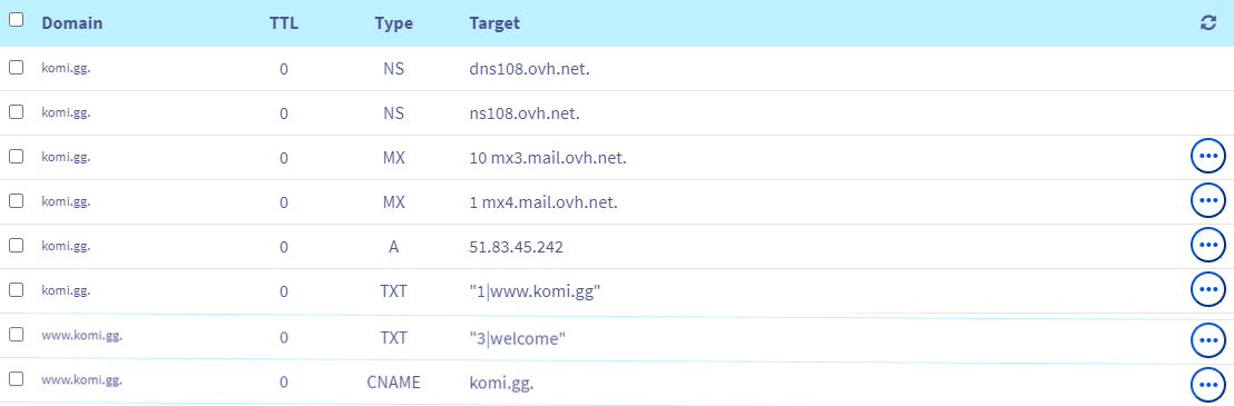 J'ai acheté un nom de domaine (komi.gg) sur ovh il y a quelques jours. J'ai ajouté une entrée A et CNAME dans la zone DNS.