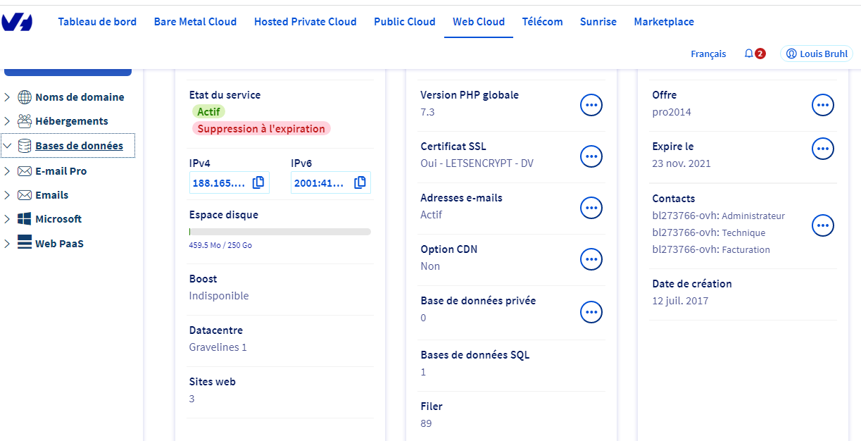 Lorsque je vais dans l'espace client, section "webcloud" puis "hébergement" je ne trouve pas le pack d'hébergement. Sur la page ne figue que le nom "base de données" sans information ni possibilité de cliquer dessus.