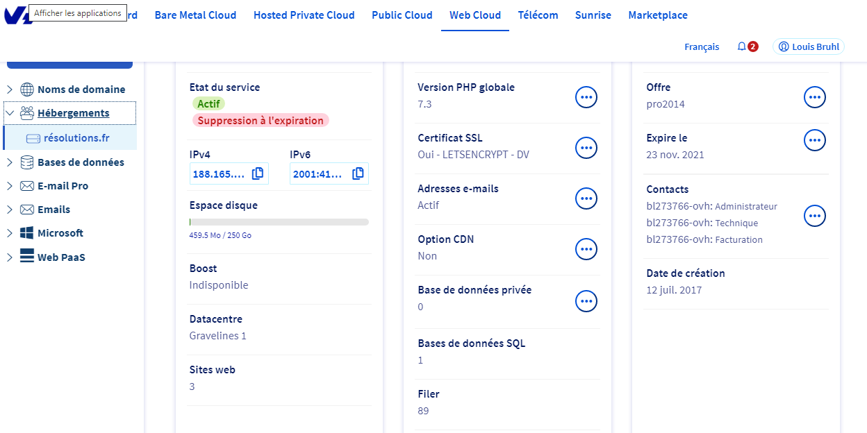 **Manager OVH > Web Cloud > Hébergement > VotreDomaine > Informations générales**