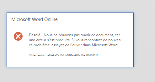Lorsque je clique sur une pièce jointe pdf ou .docx ou .xlsx pour avoir un Aperçu, la pièce jointe était ouverte par Microsoft Online. Depuis 3 ou 4 jours cela ne fonctionne plus du tout. Un message Désole nous ne pouvons pas ouvrir le fichier. Nous n'avons pas trouvé le fichier demandé. Peut être avez vous renommé, déplacé, ou supprimé le fichier. Or le téléchargement de la pièce fonctionne bien donc le fichier est bien là ou il doit être.