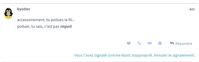**_Monsieur /Madame @kyodev, je ne mêle pas de vos réponses, alors gardez vos commentaires insidieux et forts malpolis._**
