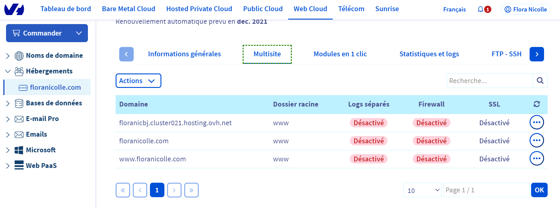 **Manager OVH > Web Cloud > Hébergement > VotreDomaine > Multisite**