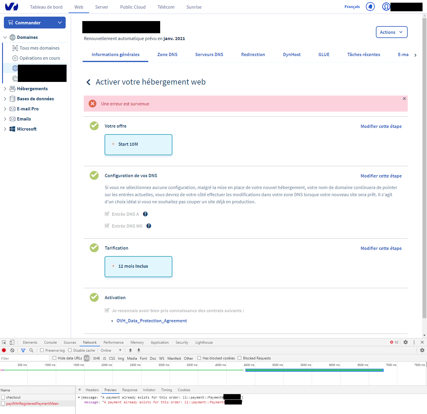Même problème, je n'arrive pas à activer Start10M. J'obtiens un message "Une erreur s'est produite". L'erreur est plus explicite dans la console de Chrome, où je peux voir la réponse à la requête suite au clic du bouton Activer : "A payment already exists for this order: l1::payment::Payment#XXXXXXXX".