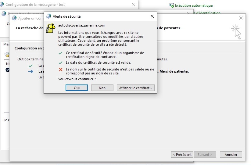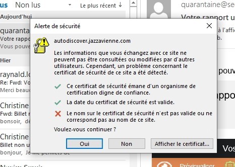 Depsui cette bascule, à l'ouverture d'Outlook (en interne, comme à l'estérieur du réseau) nous avons un message d'erreur à l'ouverture "le nom sur le certificat de sécurité n'est pas valide ou ne correspond pas au nom de ce site"