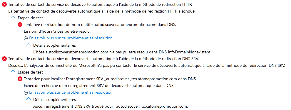 Je vous remercie grandement pour vos réponses et votre expertise. Existe t-il une solution pour remédier à ce problème ? J'ai changé de fournisseur DNS puisqu'un site internet WIX est rattaché au domaine atomepromotion.com . Est-il possible selon vous de faire une petite bascule pour revenir à la zone DNS ns102.ovh.net (nécessitant la mise en stand-by du site internet) afin d'y réaliser les enregistrements autodiscover/srv et ainsi activer le fonctionnement total du compte Exchange. Puis une fois ces réglages effectué, revenir sur un hébergement wix (afin de remettre en ligne le site internet) ?