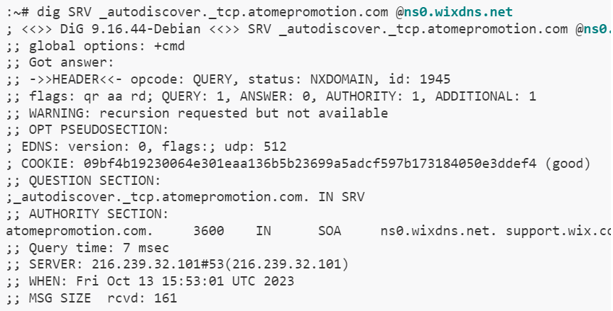 :~# dig SRV _autodiscover._tcp.atomepromotion.com @ns0.wixdns.net