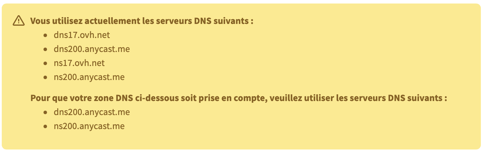 Il faut arriver à renseigner les deux serveurs dns200.anycast.me et ns200.anycast.me auprès du registre, pouvez-vous faire une copie d'écran de Web Cloud > Domaines > Serveurs DNS ?