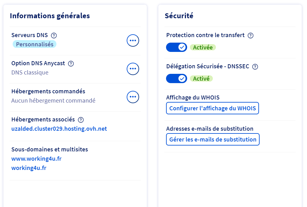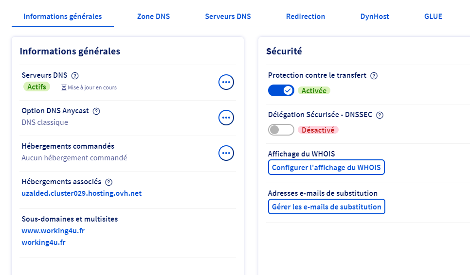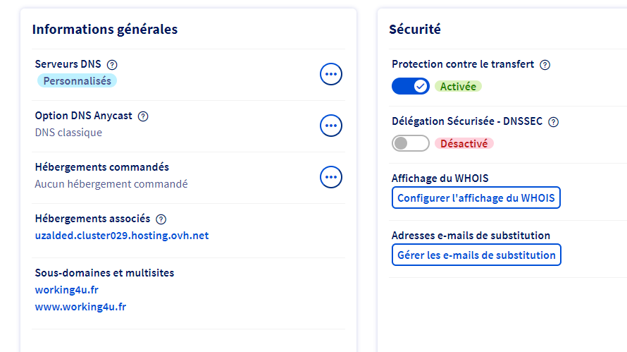 Voici mon problème. J'ai un nom de domaine chez OVH : working4u.fr