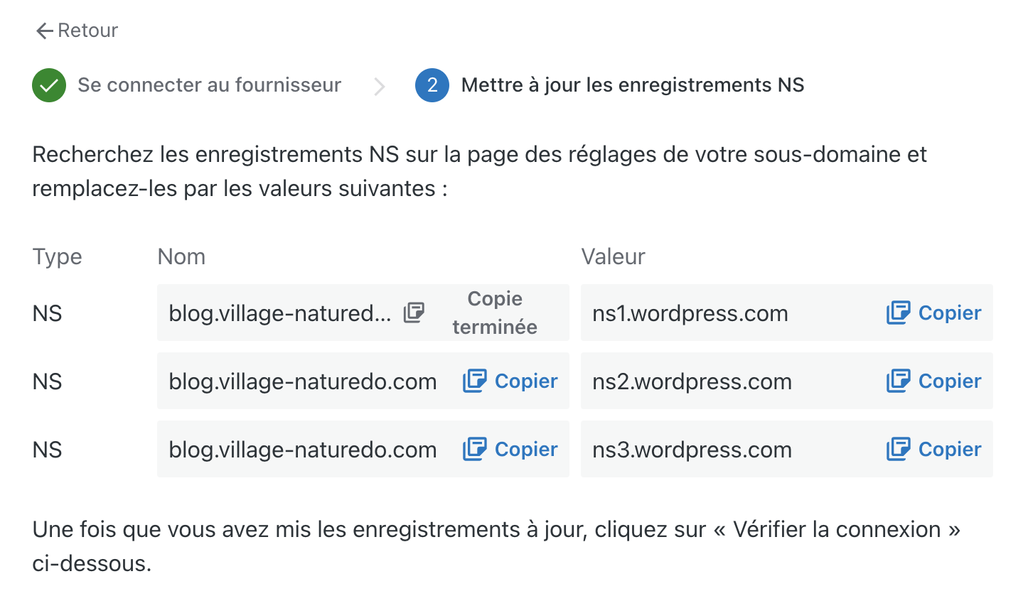 Pour l'instant je ne peux rien ajouter car Wordpress m'indique d'ajouter des enregistrements NS sur mon sous-domaine mais je ne le trouve pas dans ma zone DNS, je ne peux donc pas les ajouter ...
