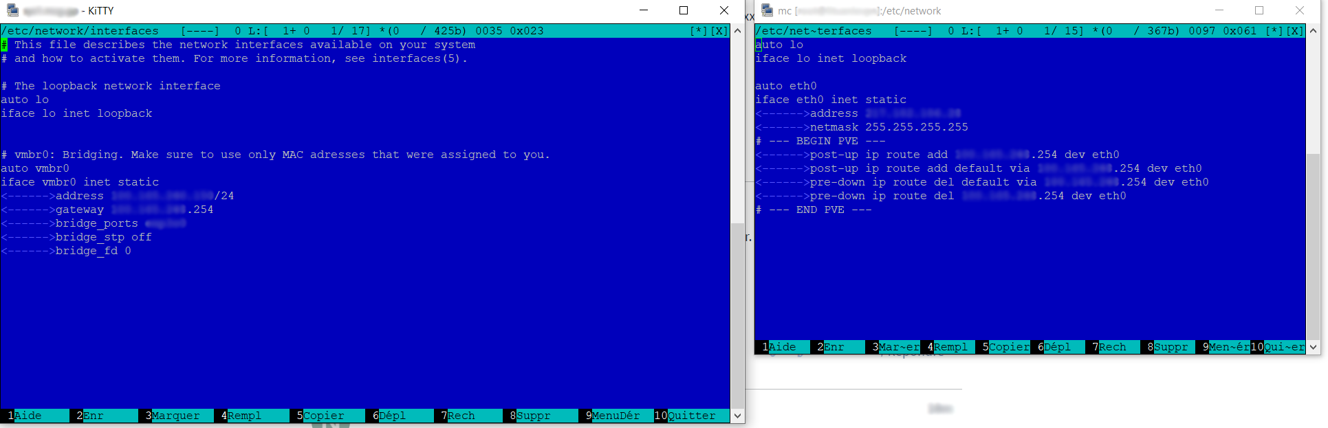 _ps: ah oui, aussi, je n'ai que des conteneurs LXC, pas de VM. J'en avais une mais je ne sais plus si j'avais essayé la VM ou le CT comme deuxième guest. Mais le mélange fonctionne apparemment, voir https://community.ovhcloud.com/community/fr/kvm-debian-10-ip-failover?id=community_question&sys_id=fa527dc4f5d246d02d4c5f7a9ab36150 https://community.ovhcloud.com/community/fr/kvm-debian-10-ip-failover?id=community_question&sys_id=fa527dc4f5d246d02d4c5f7a9ab36150. Et au passage, pour les CT aucune ligne de configuration supplémentaire autre que ce qui est fait dans la GUI. _