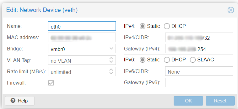 Au cas où je suppose que tu l'as fait, je te rappelle, qu'il faut indiquer dans la config GUI du LXC, l'adresse MAC associé à l'IPFO, adresse MAC que tu as générée sur le portail d'administration d'ovh.