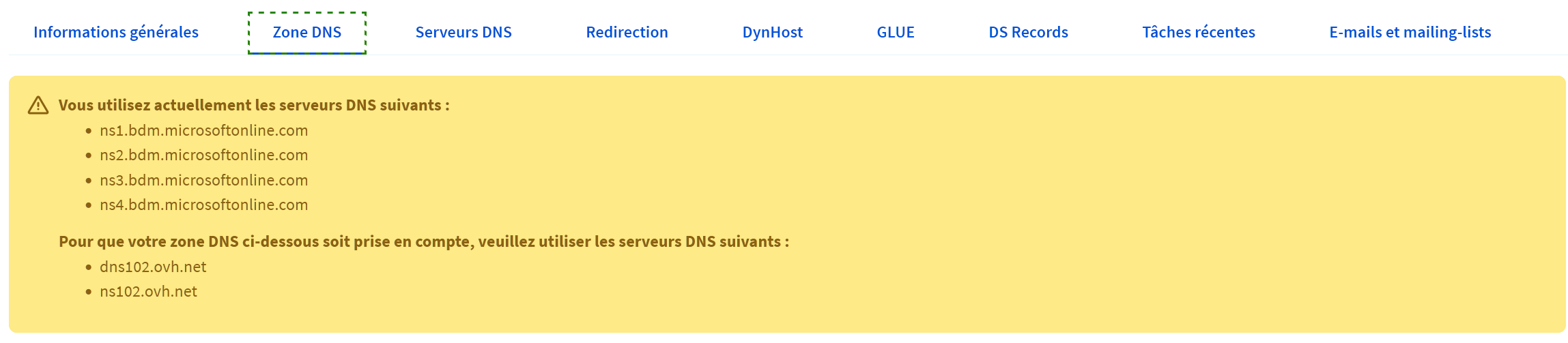Mon domaine est "maintenu" par OVH depuis un certain temps, par ailleurs j'ai la suite Office 365 directement acquise et gérée par Microsoft et de fait ma messagerie électronique est hébergée sous Exchange toujours gérée par Microsoft.