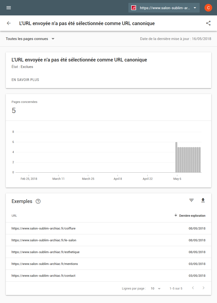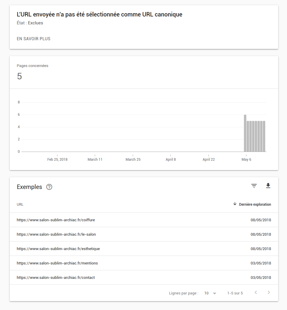 - 5 pages exclues (L'URL envoyée n'a pas été sélectionnée comme URL canonique)