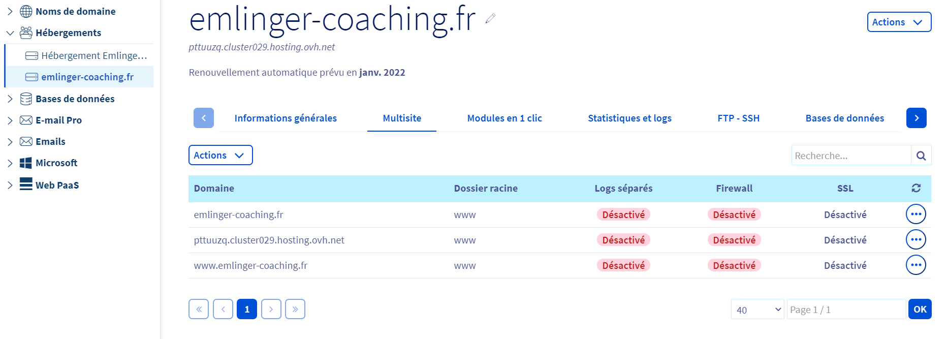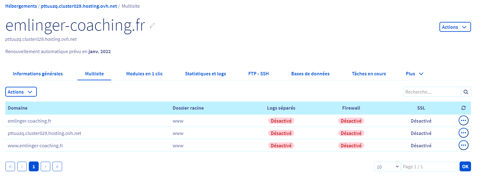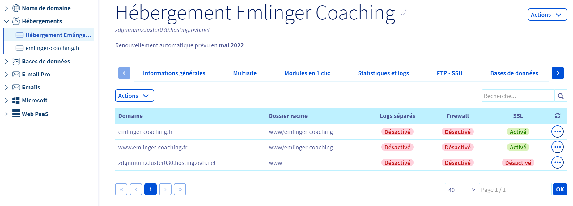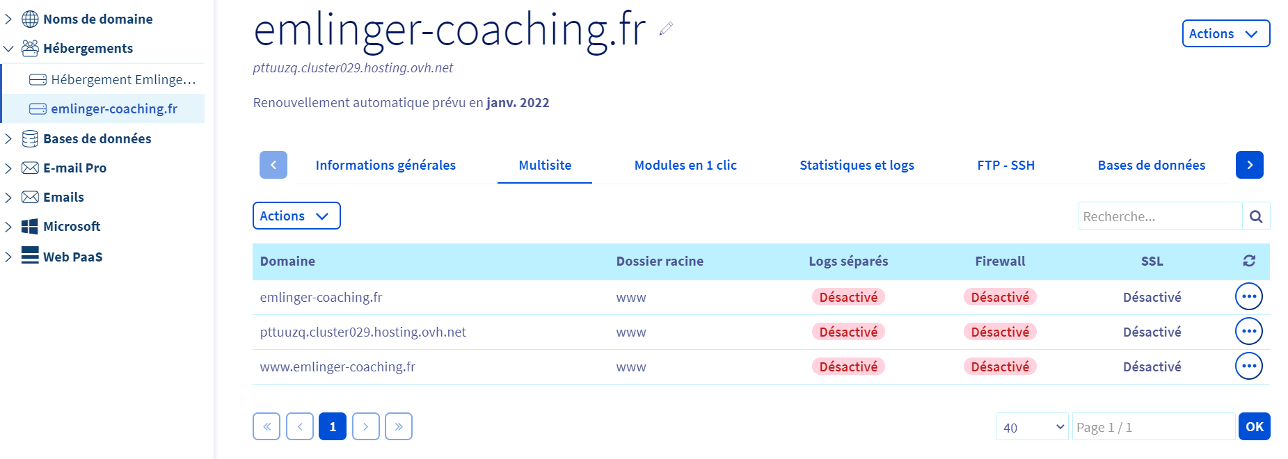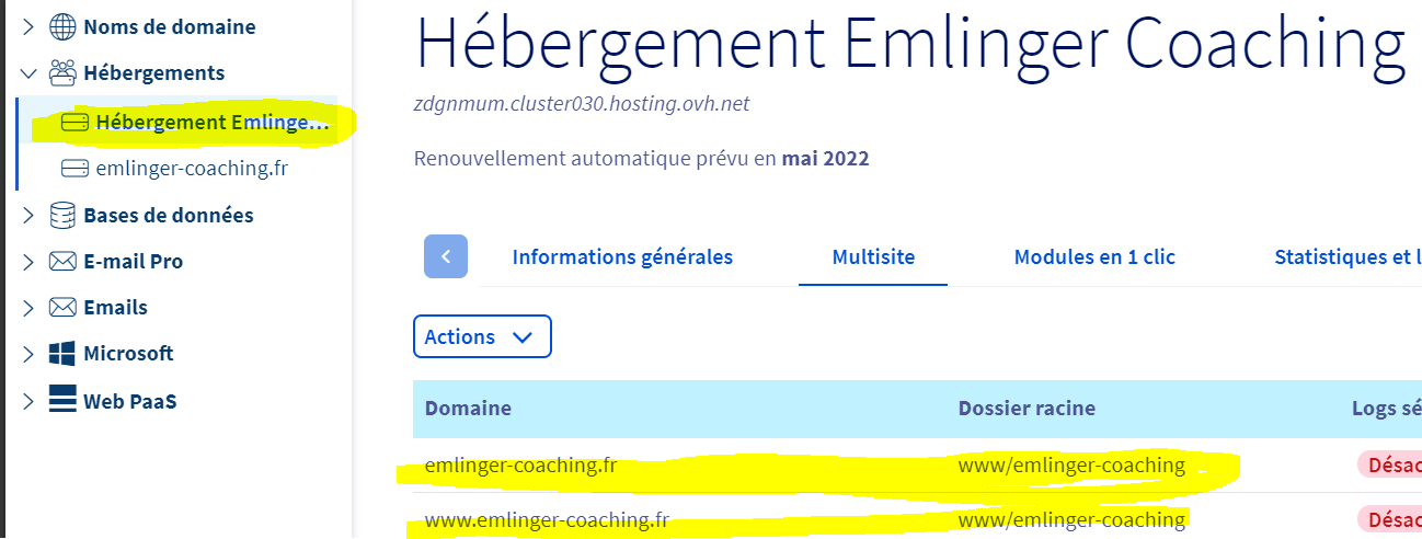 Manager OVH > Web Cloud > Hébergement > VotreDomaine > Multisite
