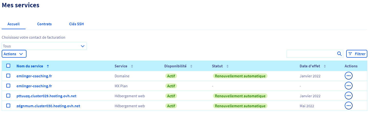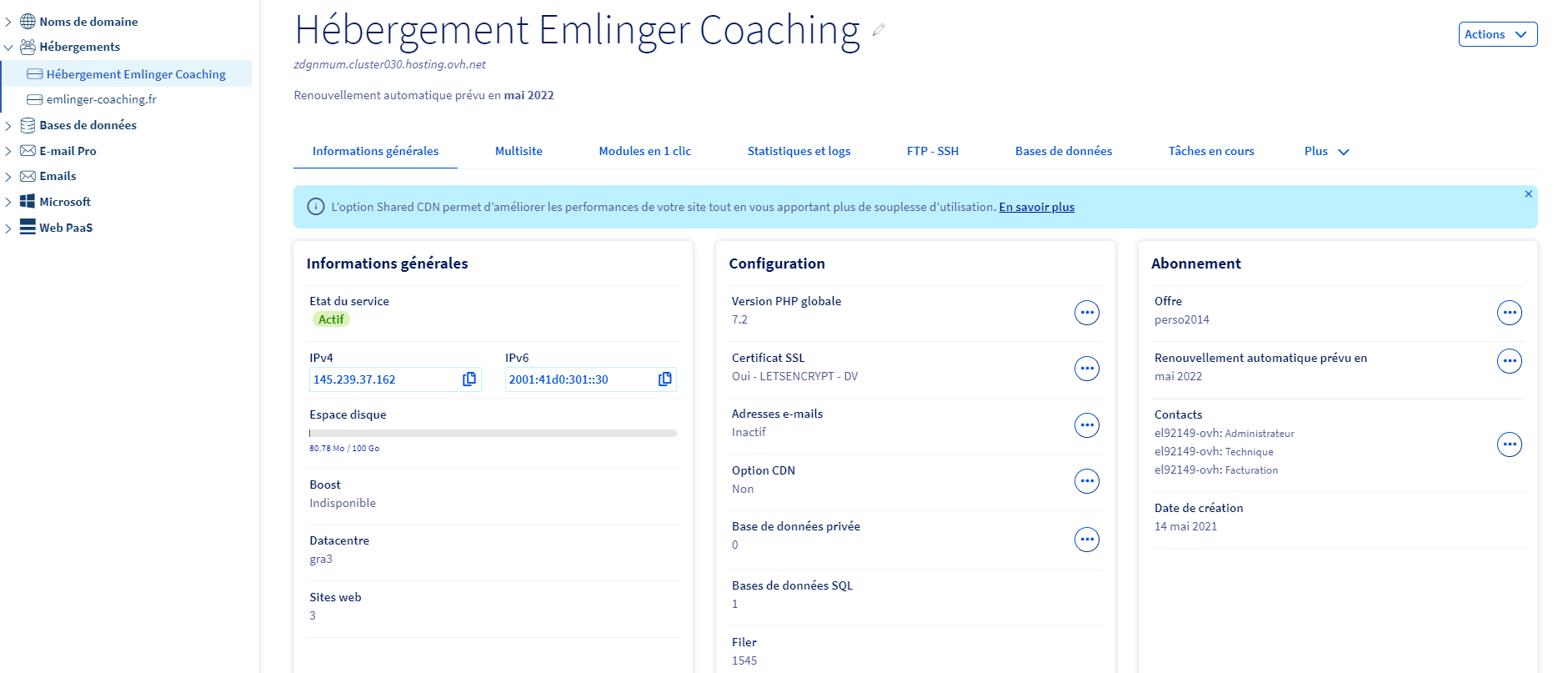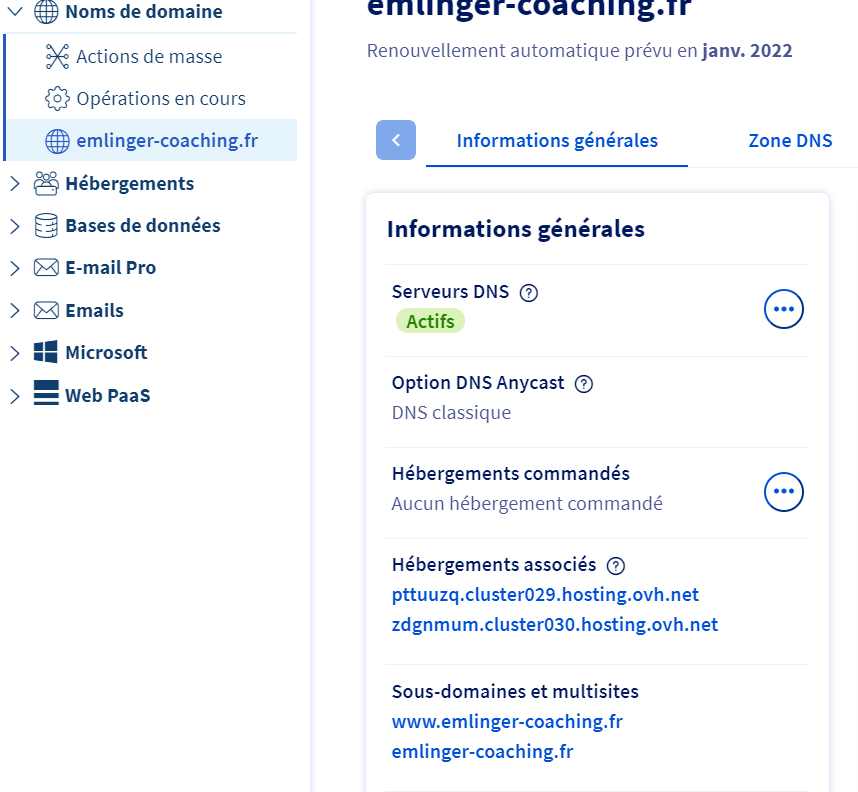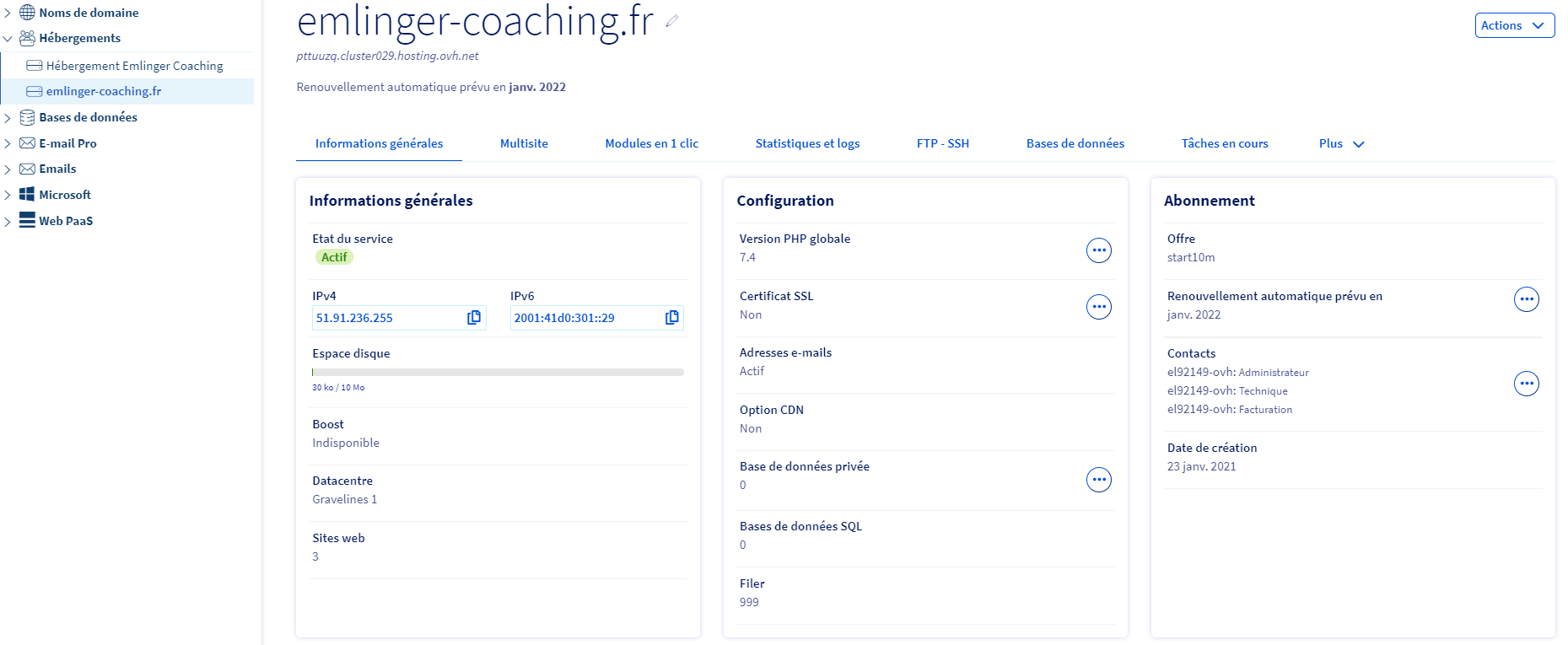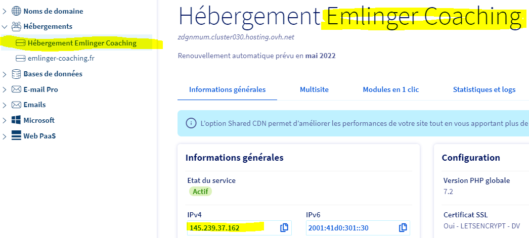 Manager OVH > Web Cloud > Hébergement > VotreDomaine > Informations générales