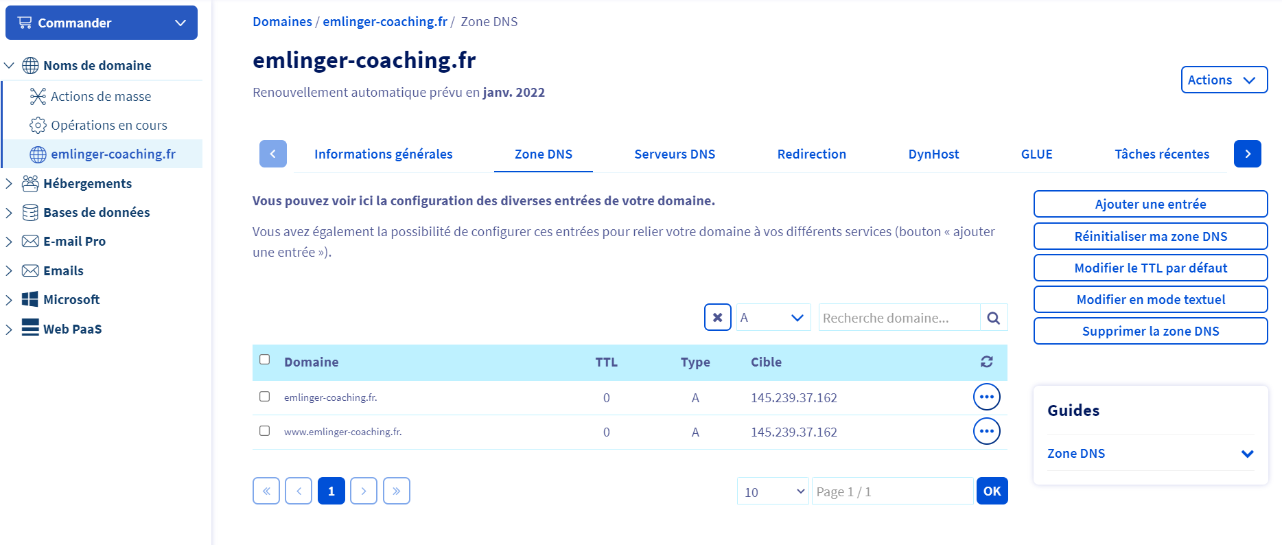 Quelques activations comme le plan MX pour les mails et le tour était joué.