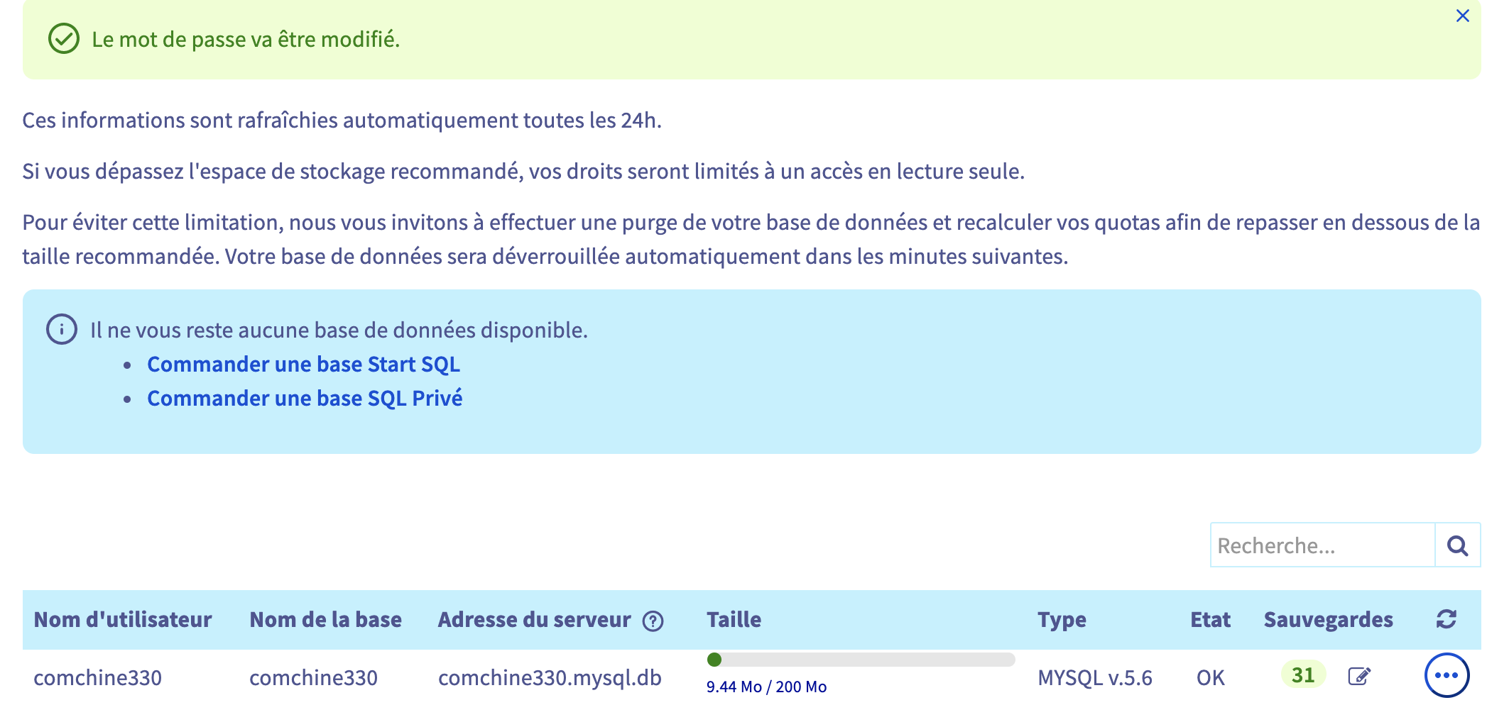 manager Ovh/hébergement/base de données: change le mot de passe avec celui noté