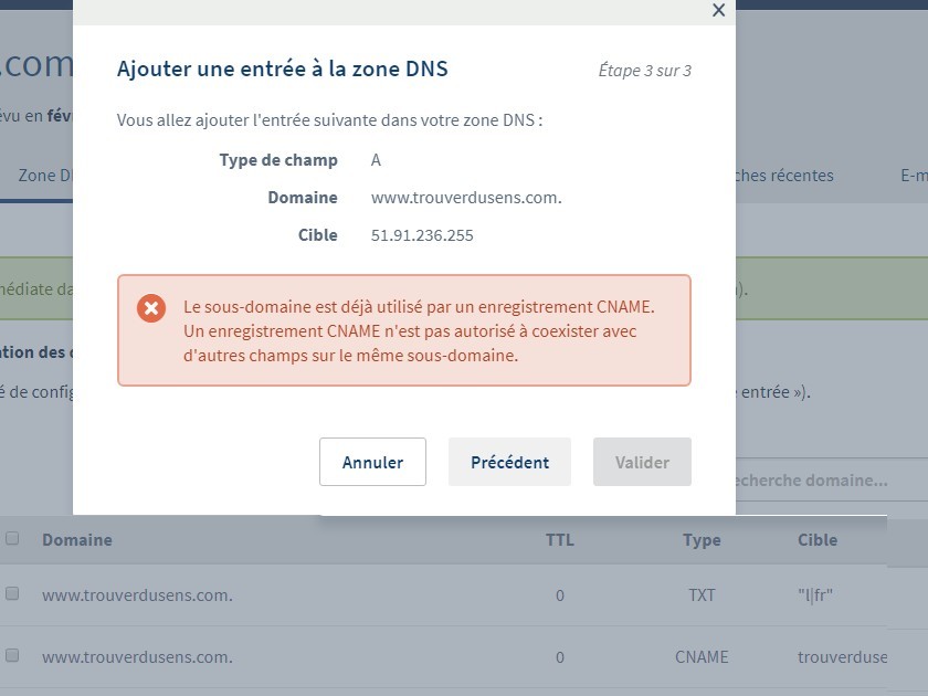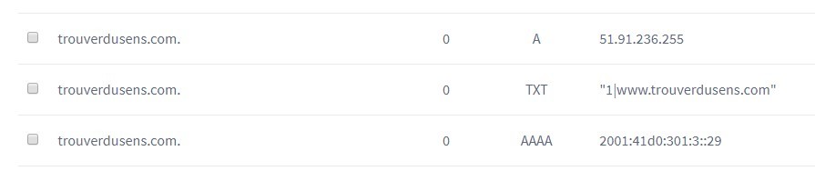 manager Ovh/domaine/zone DNS: corrige les deux entrées **A** avec **51.91.236.255** ```