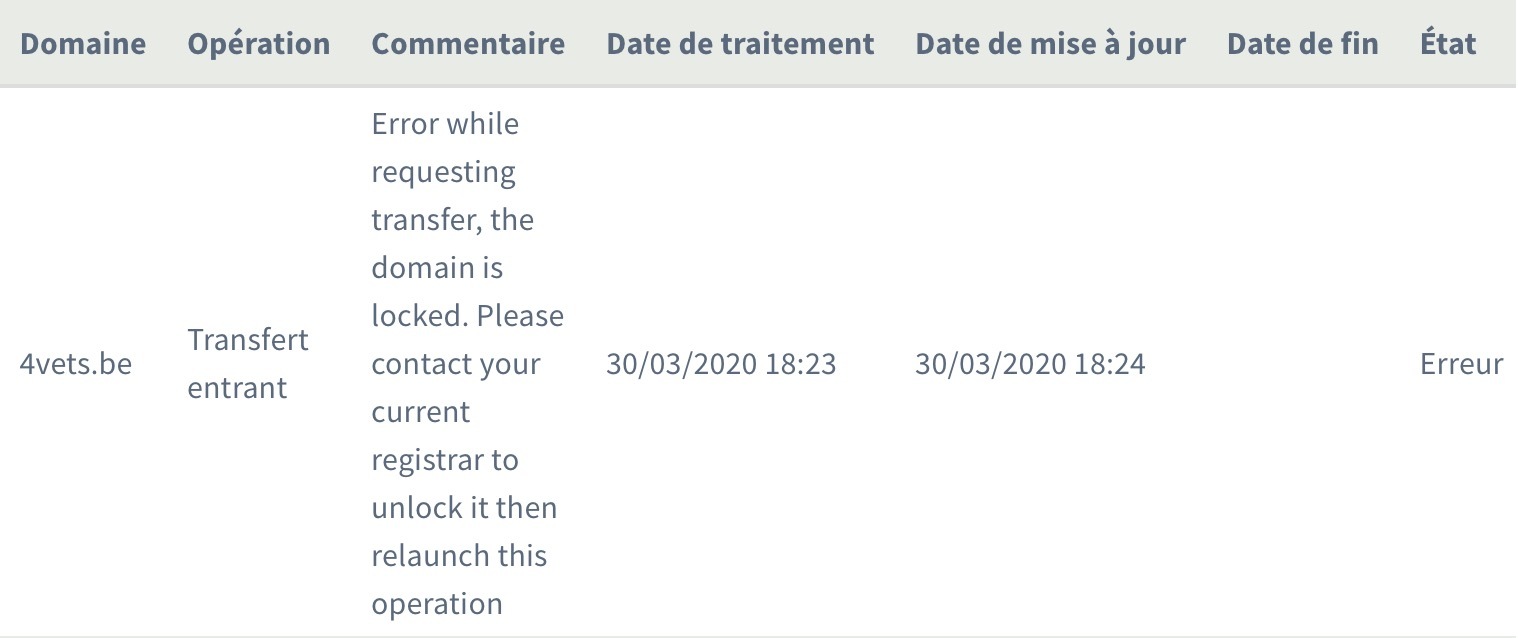 Je viens de relancer l'opération, j'ai reçu un email de dns.be avec le code transfert et maintenant c'est "Transfer request sent to registry".