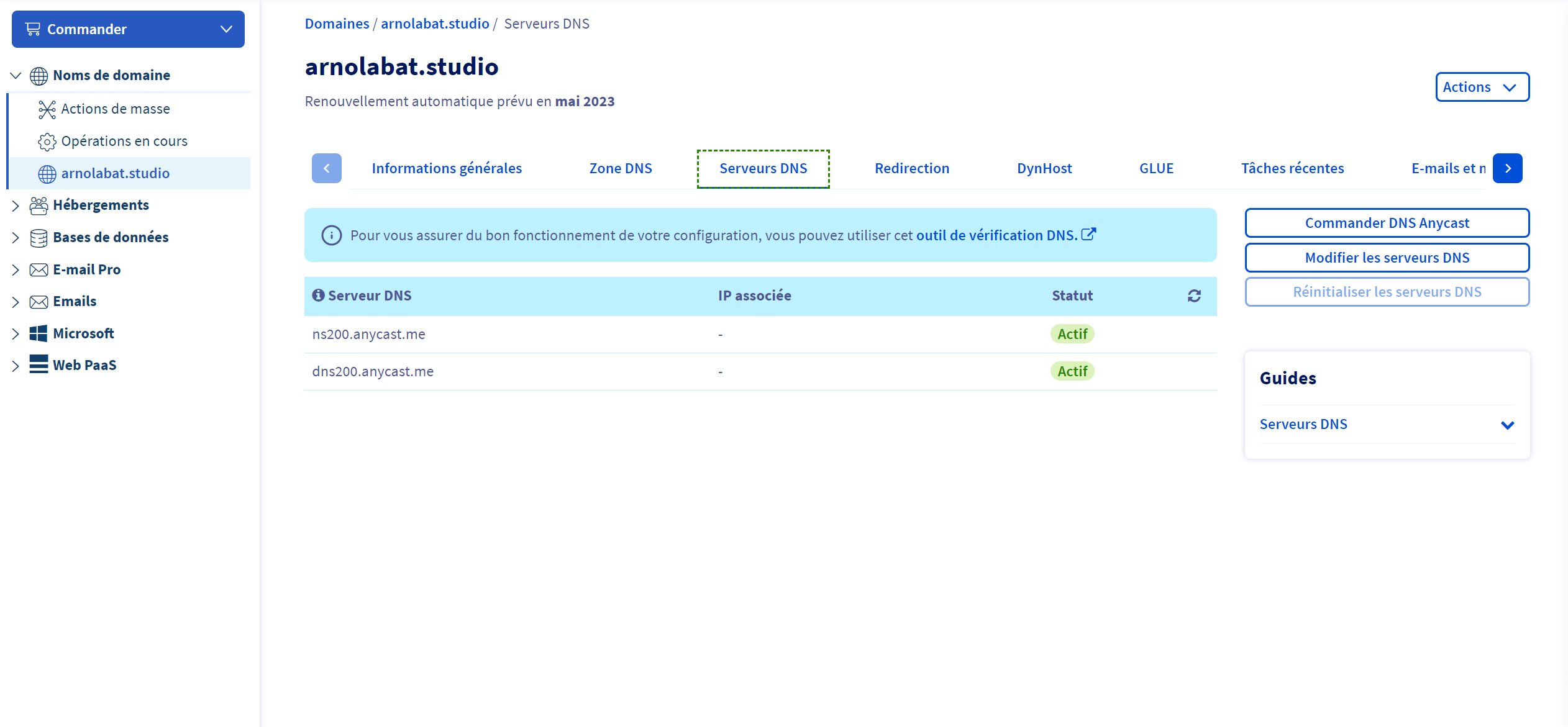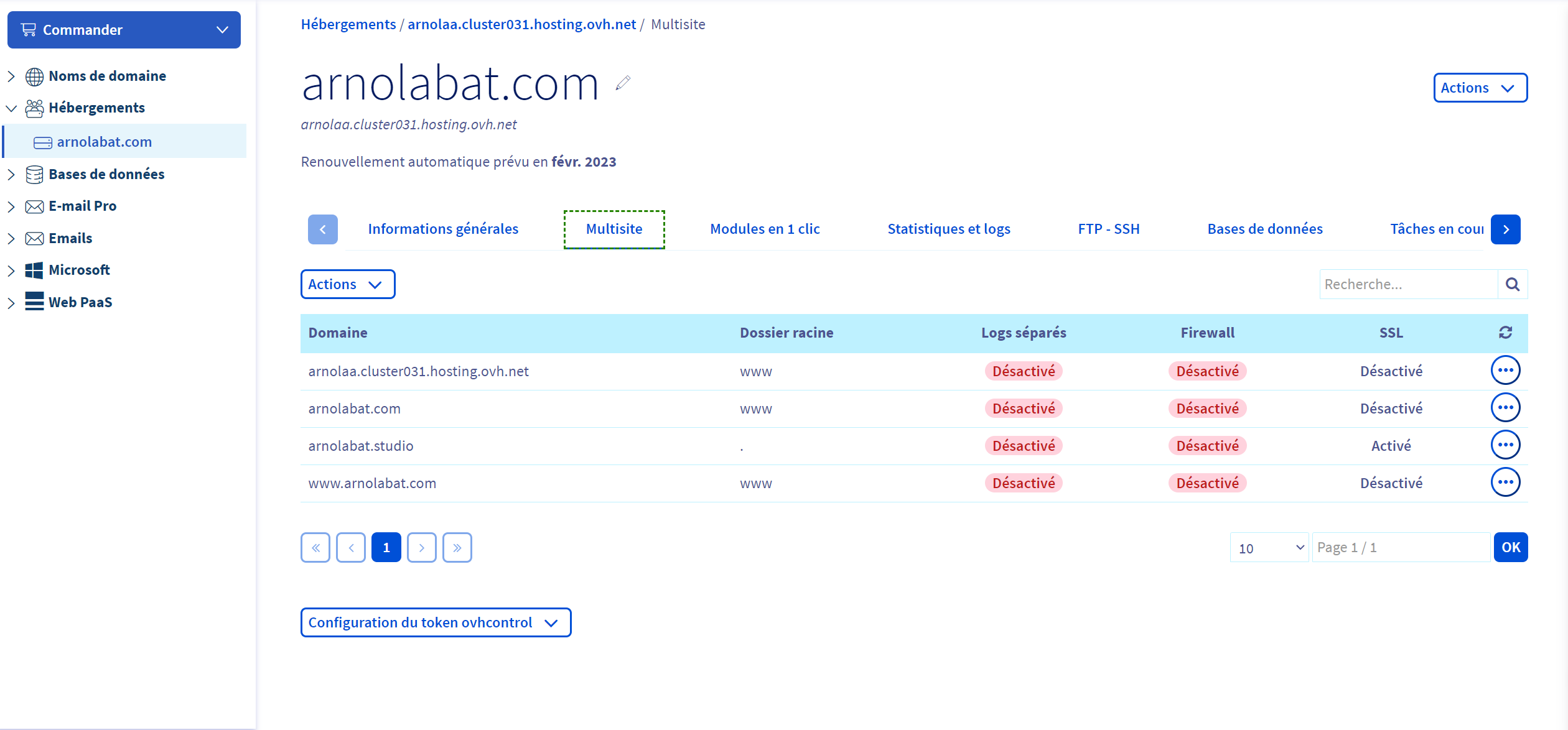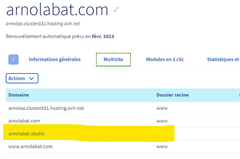 Alors voici les captures dans l'ordre (dans la rubrique "Domaine" il n'y a que arnolabat.studio et dans la rubrique "Hébergement" il n'y a que arnolabat.com).