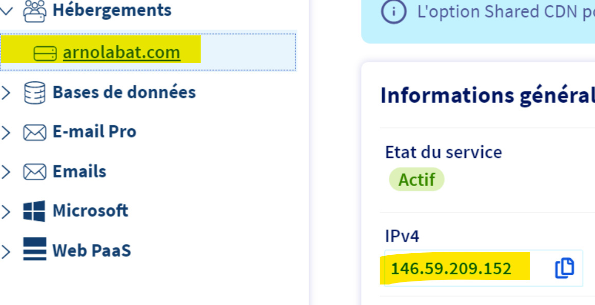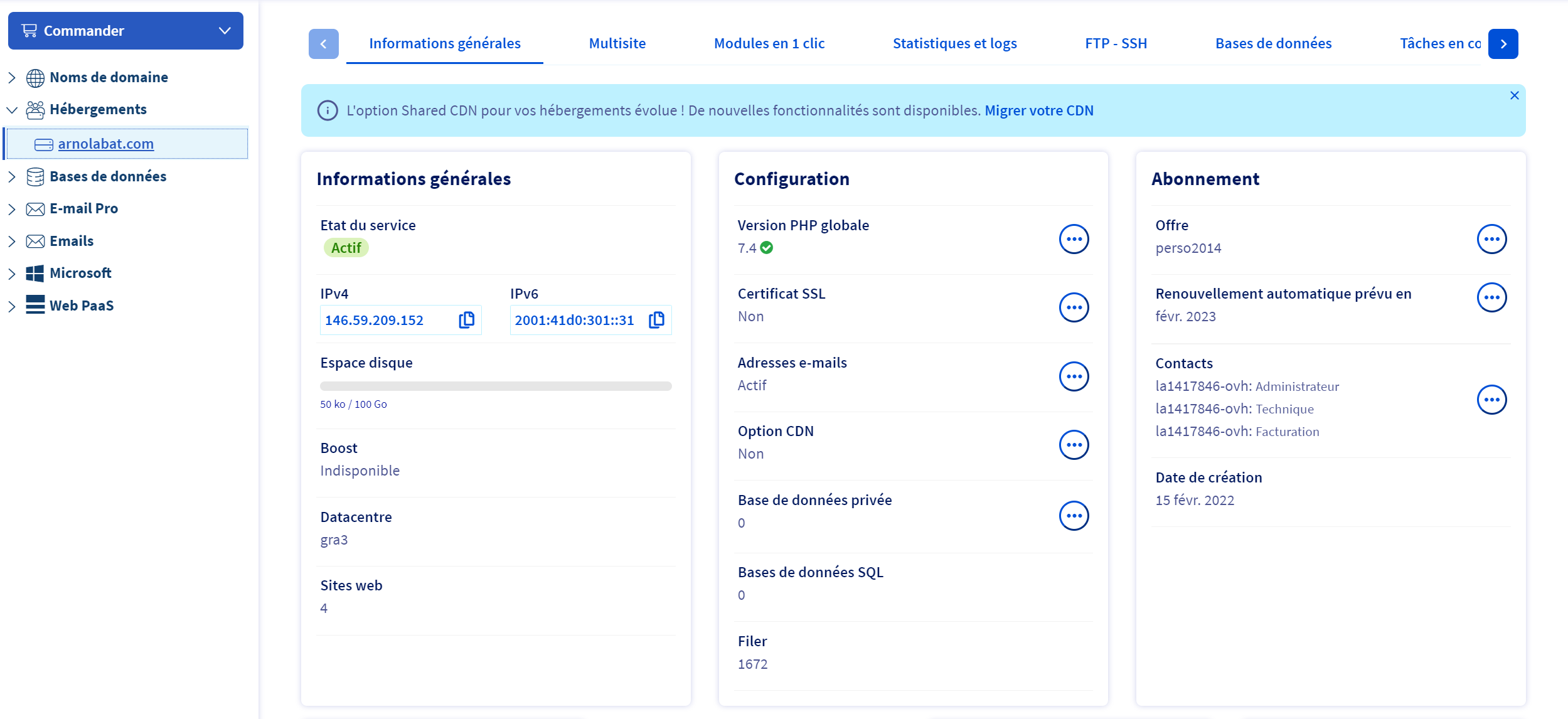 **Manager OVH > Web Cloud > Hébergement > VotreDomaine > Informations générales**