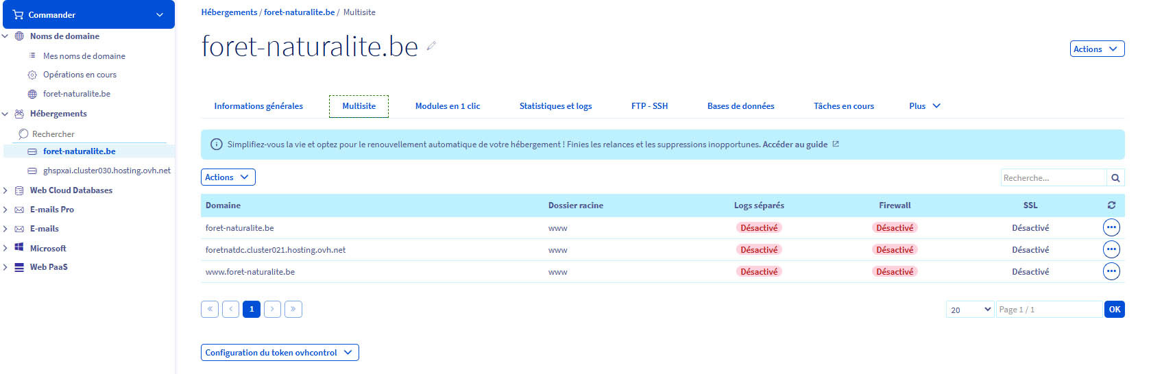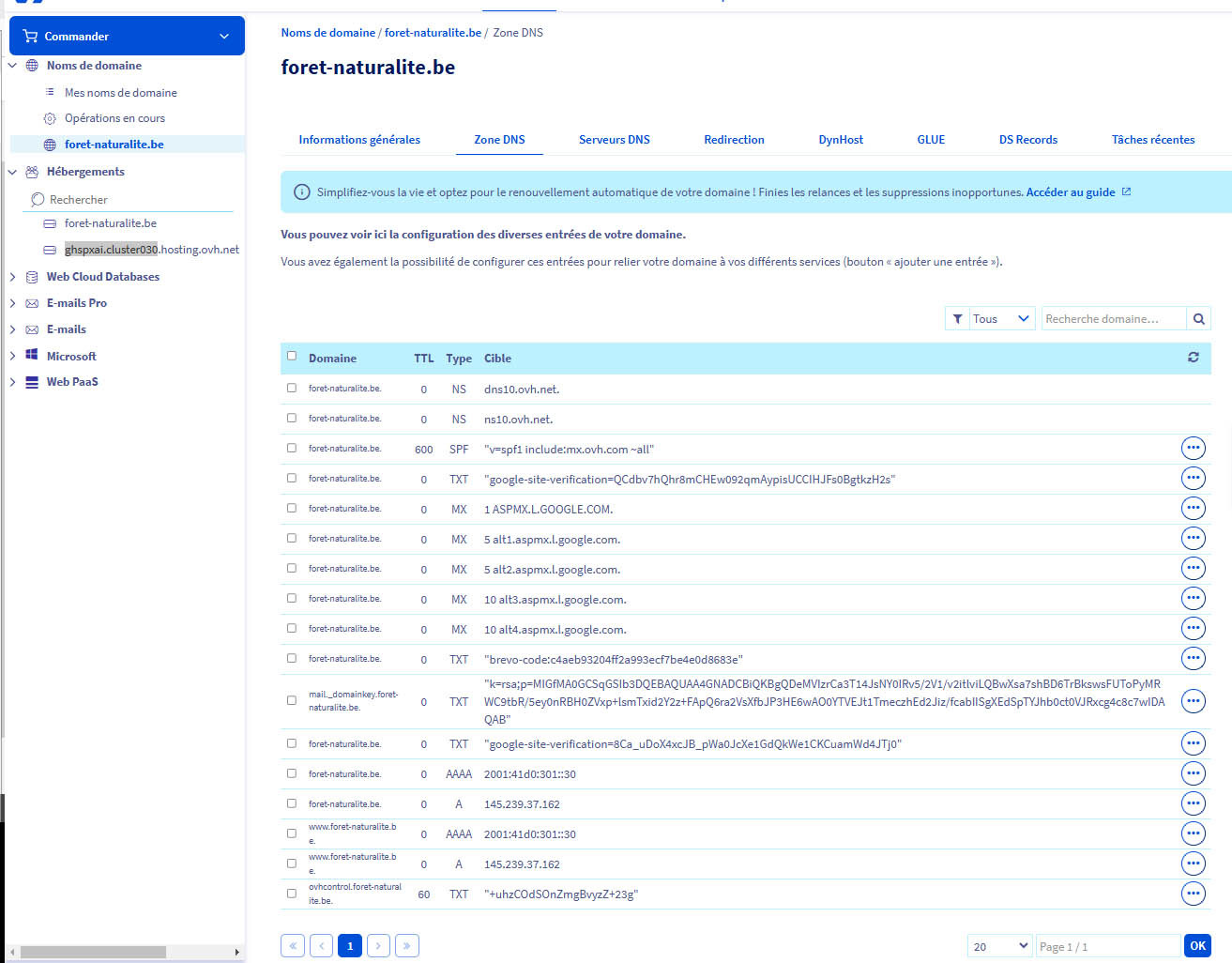 Ce que j'ai fait : Ajouté ndd foret-naturalité dans le multisite de l'hébergement Performance 1 (e.) mais là j'ai le message d'erreur 400 could not create... . Le dns TXT avec ovhcontrol est lui bien inséré dans la zone dns du ndd foret-naturalite.be.