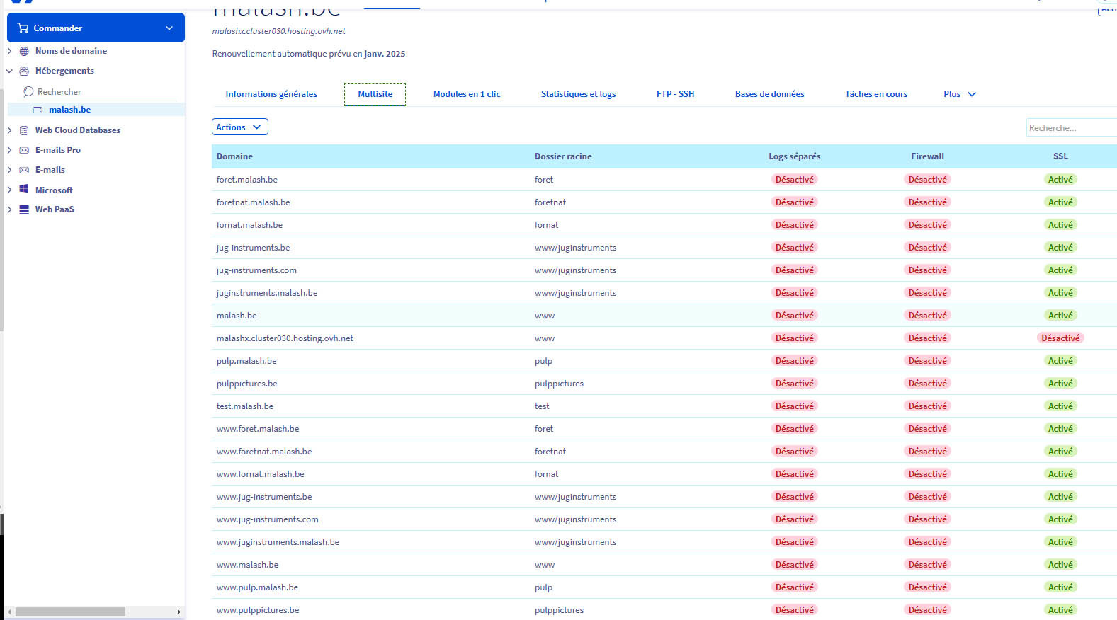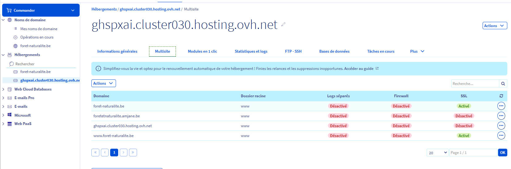 Sur un compte ovh il y a le nom de domaine foret-naturalite.be (que je voudrais lier à une hébergement ovh externe ce webcloud) et deux hébergements : un nommé foret-naturalite.be (un Hébergement gratuit 100M) et l'autre ghspxai.cluster030... (un hébergement perso)