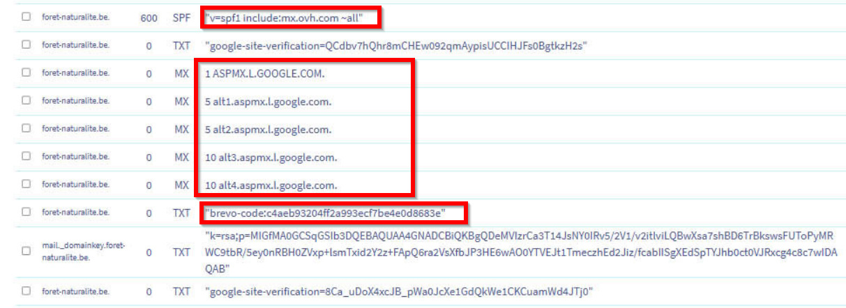 Il faudrait dire à votre client de corriger son SPF qui n'autorise ni les envois depuis Google, ni depuis Brevo.