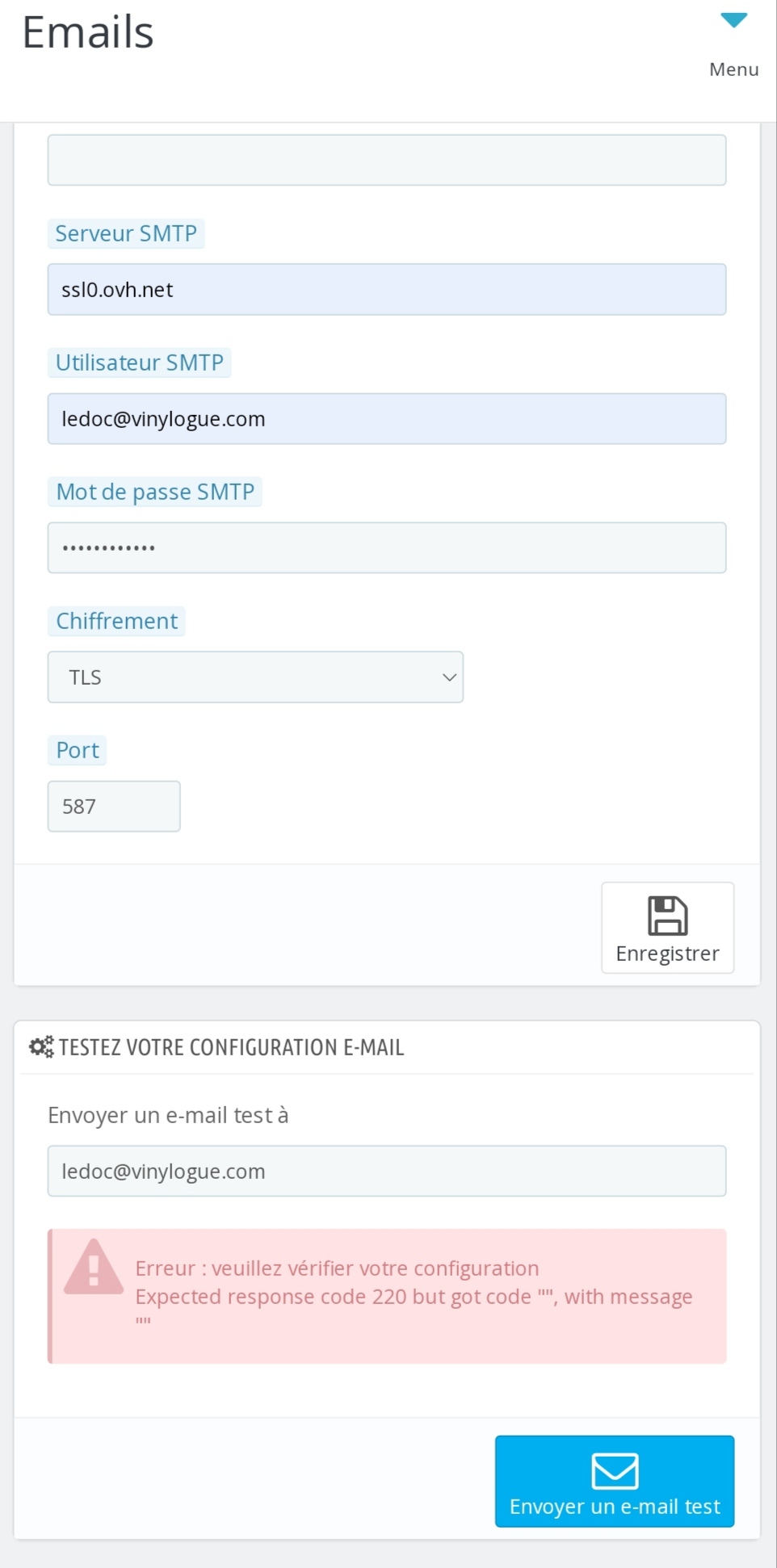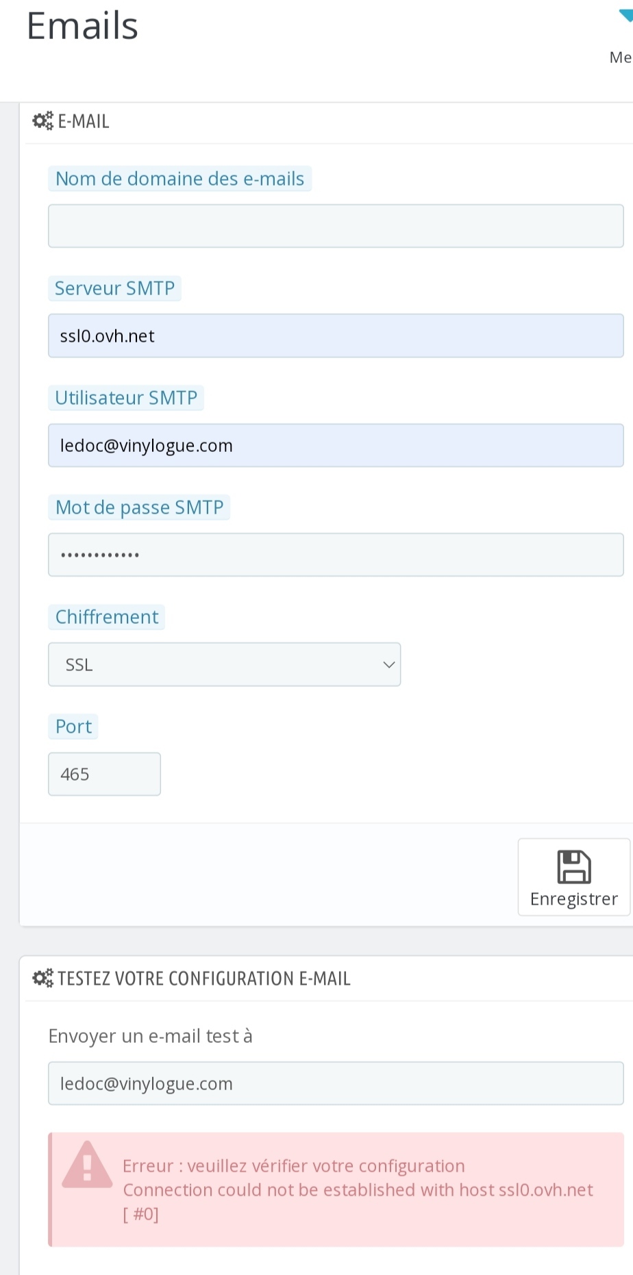- lorsque je fais le test d'envoi depuis la config email en smtp ssl0.ovh.net SSL 465 ça fonctionne une fois sur 10, j'ai le message qui me dis que le mail est bien parti, je le reçois (config ci dessous)