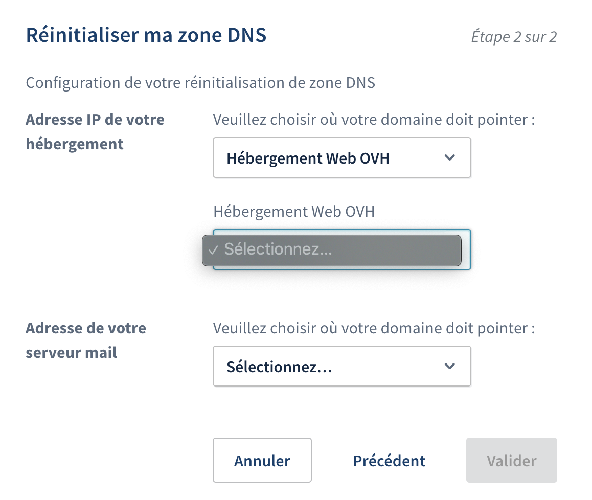 Lorsque je souhaite paramétrer la zone DNS en cliquant sur "réinitialiser ma zone DNS" je ne comprends pas ce qu'il faut choisir dans la fenêtre qui s'ouvre (voir screen).