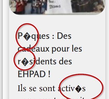Oui, oui, on a été prévenu, ça fonctionne et des sauvegardes j'en ai, de tout. La sauvegarde de la base de données remplacée tout à l'heure n'a rien donné. Il y a déjà eu de problème de caractères sur ce site, une version obsolète de gestion des caractères et après modification, c'est revenu. Il y a six mois environ.