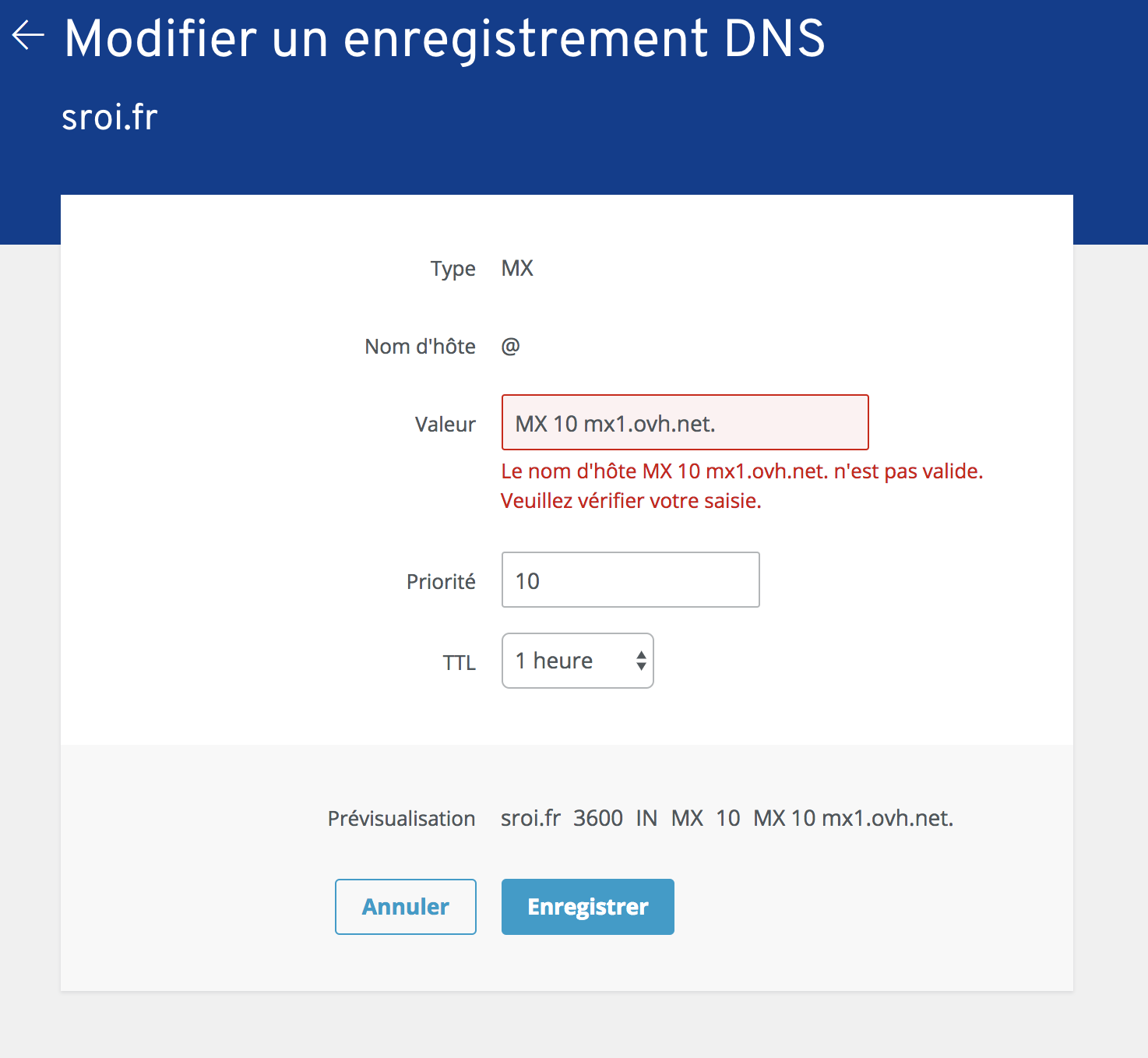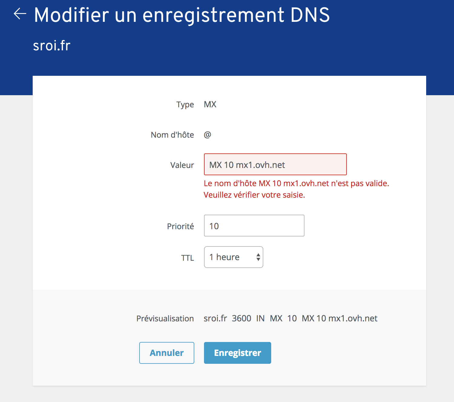 Merci. Petit soucis, lorsque je modifie le premier MX en le remplaçant par l'un des 3 que tu m'a donné, j'ai un message d'erreur. (Capture d'écran joint)