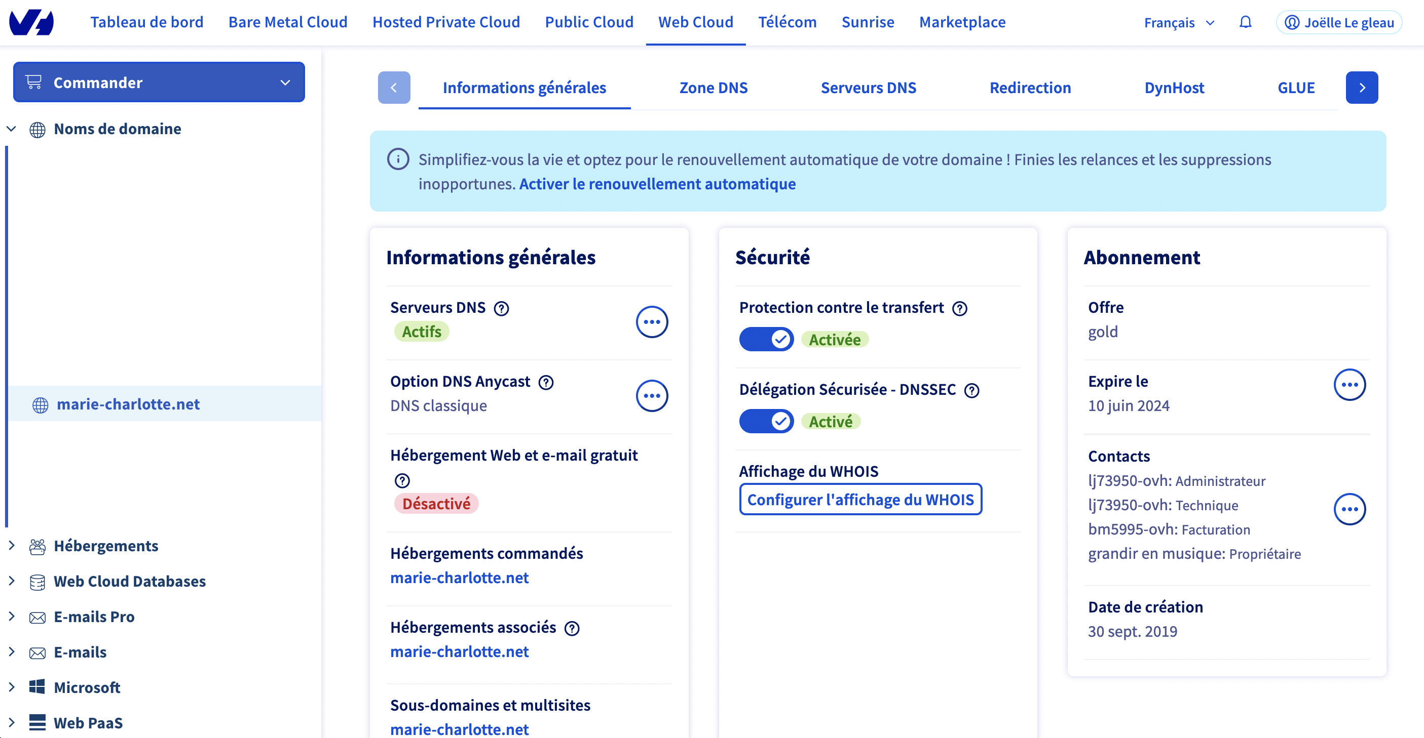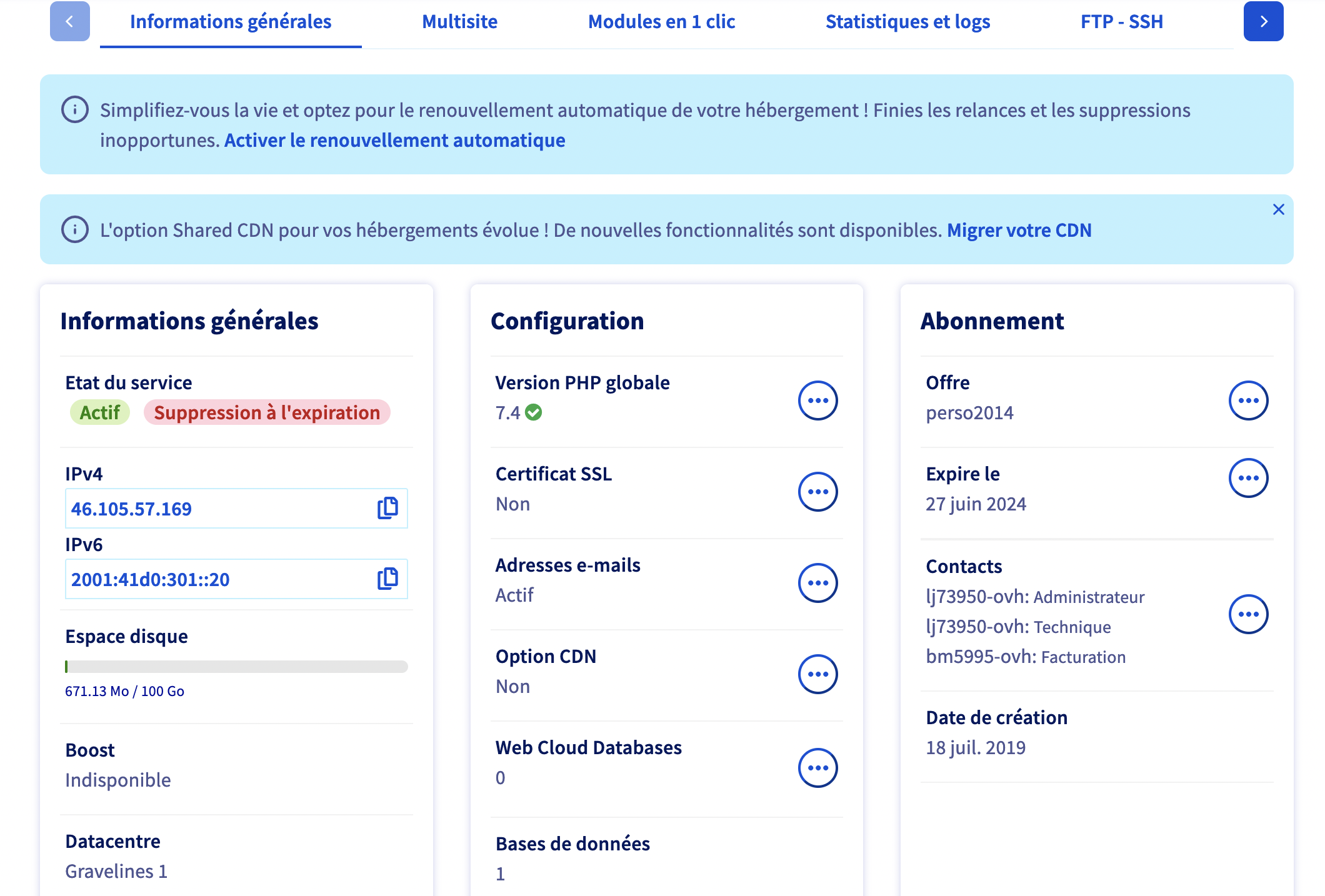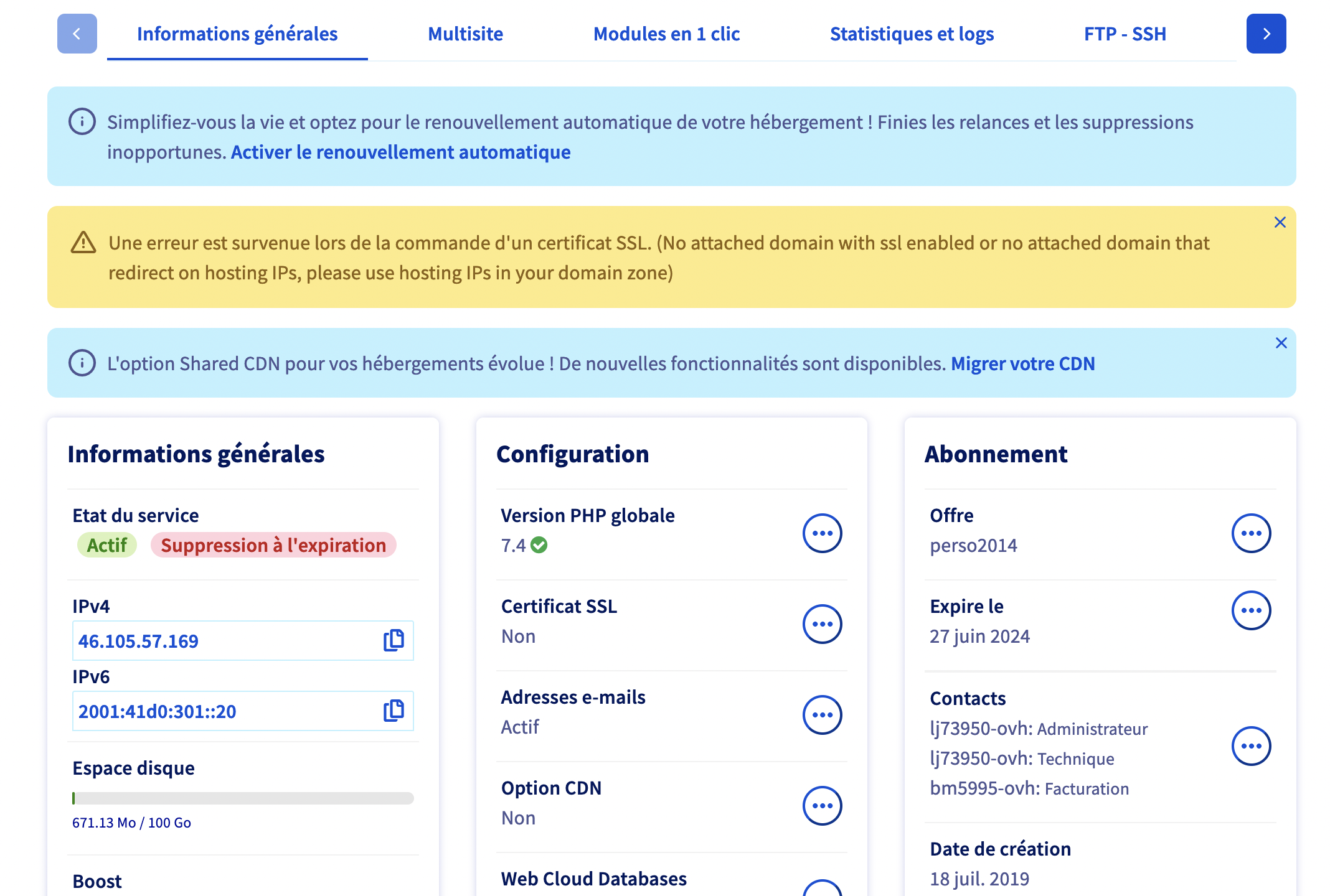 **Manager OVH > Web Cloud > Hébergement > VotreDomaine > Informations générales**