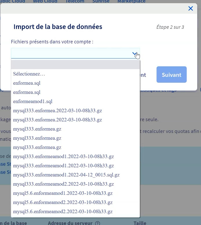2e étape : Importer cette sauvegarde dans la nouvelle base de données depuis votre espace client : https://docs.ovh.com/fr/hosting/mutualise-guide-importation-dune-base-de-donnees-mysql/#importer-votre-propre-sauvegarde-depuis-lespace-client