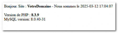 <?phpecho " Bonjour. Site : <b>VotreDomaine</b> - Nous sommes le ".date ("Y-m-d H:i:s")."<br>";echo "<br>";echo "Version de PHP : <b>".phpversion()."</b> <br>";// Create a connection to MySQL$conn = new mysqli('localhost', 'root', 'your_password');// Check connectionif ($conn->connect_error) {die("Connection failed: " . $conn->connect_error);}// Get MySQL versionecho "MySQL version: " . $conn->server_info;// Close the connection$conn->close();?>Voici le code ajouté sous le tien.