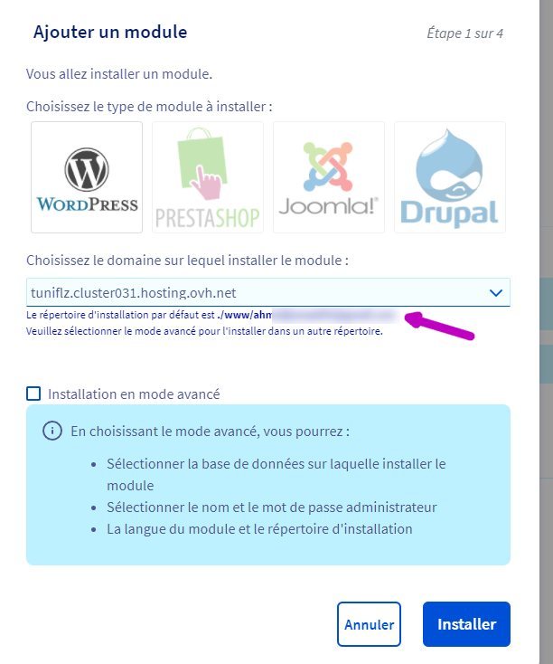 Voir --> **https://www.wordetweb.com/word-et-web/WORDPRESS-guide-installation-de-WordPress-premier-domaine-chez-OVH-FR.htm CMS - WordPress - Guide Installation chez OVH**