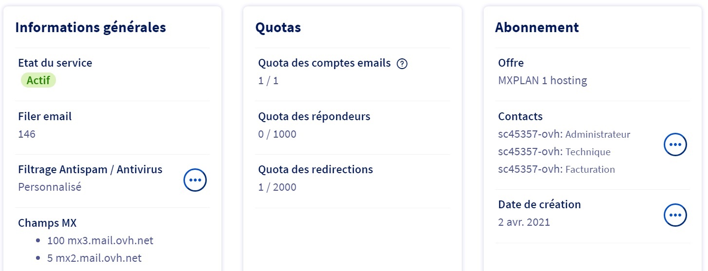 Votre situation : vous avez acheté un nom de domaine. Vous avez activé l'hébergement gratuit https://www.ovhcloud.com/fr/domains/free-web-hosting/ **Start10M** offert avec le domaine, puis le compte email **MXPLAN 1 hosting** offert avec l'hébergement.