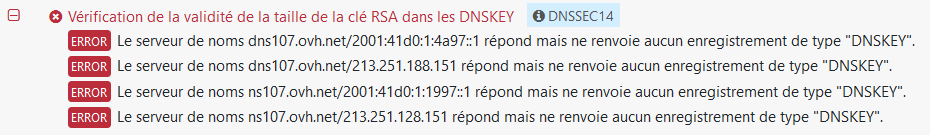Si nécessaire remettez comme serveurs DNS: ns107.ovh.net à la place des 2 autres, puis désactivez DNSSEC, et quand le whois confirme bien que DNSSEC n'est plus actif (voyez ma copie d'écran: il est actif avec Keys: ...) refaites le changement inverse.