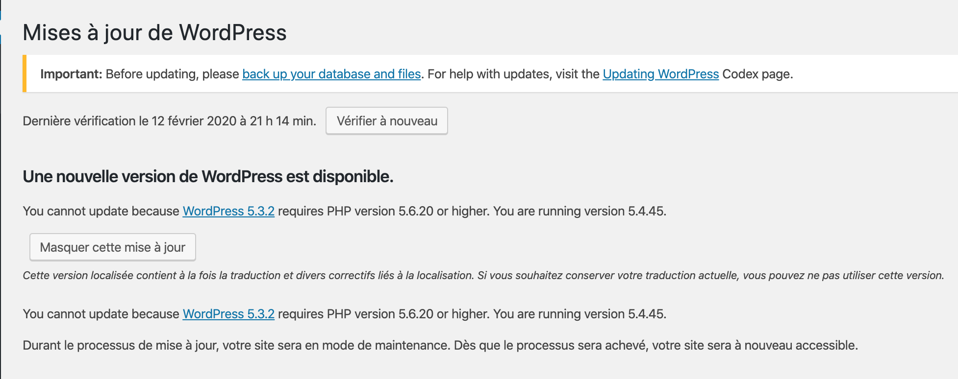 tu ne peux pas mettre à jour WP automatiquement en étant sous php5.6