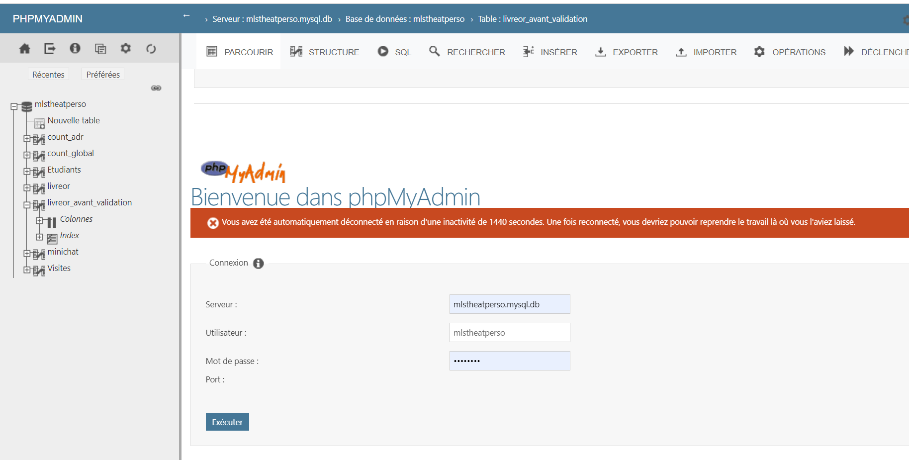 Alors pourquoi je n'arrive plus à me connecter ( à écrire, modifier..) à ma base de données: mlstheatperso