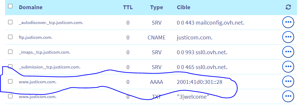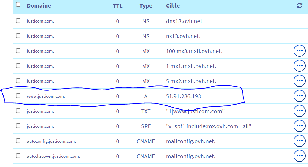 Domaines > Zone DNS > changer tous les 51.91.236.255 par 51.91.236.193