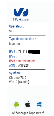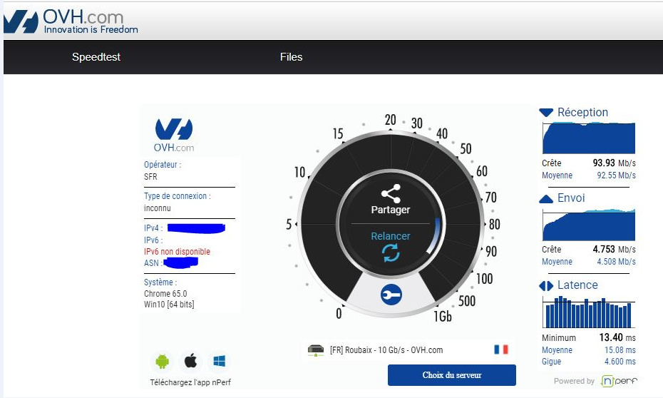 Peux-tu lancer le test de débit à la page http://ovh.net (Cliquer sur lancer le test).