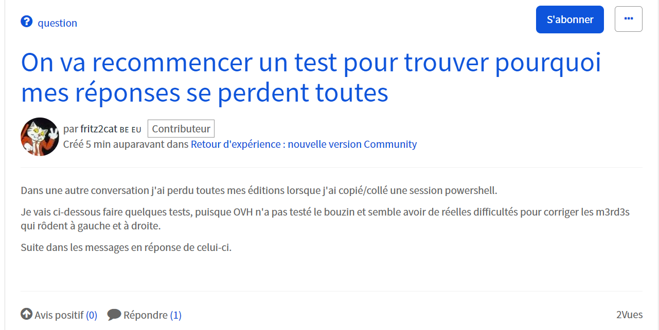 Retour d'expérience : nouvelle version Community - On va recommencer un test pour trouver pourquoi mes réponses se perdent toutes