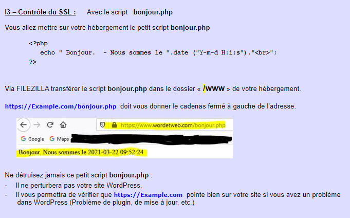 **Test du script bonjour.php :** I3 – Contrôle du SSL :