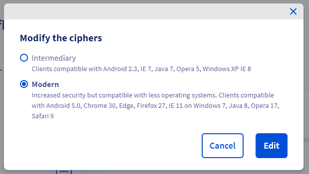 Nous avons le même problème. De la même façon, en modifiant le ciphers en "Modern" rien ne semble changer. Etait-ce la bonne solution ?