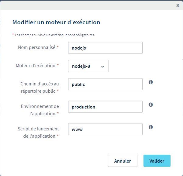 1- Passer le moteur d'exploitation en nodejs avec la config suivante: