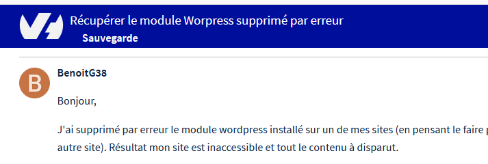 J'ai supprimé par erreur le module wordpress installé sur un de mes sites (en pensant le faire pour un autre site). Résultat mon site est inaccessible et tout le contenu à disparut.