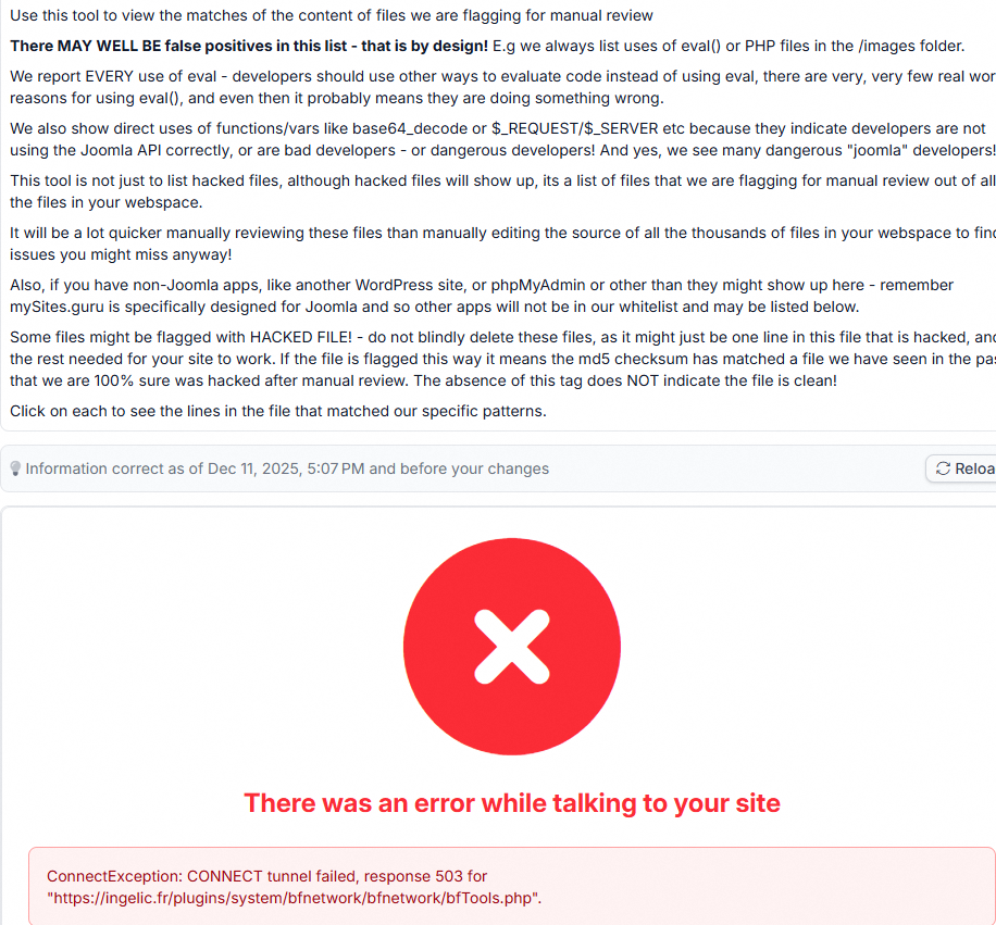 J'ai cette erreur qui apparait lorsque j'active la détection de mise à jour d'extensions avec mySites.guru pour Joomla