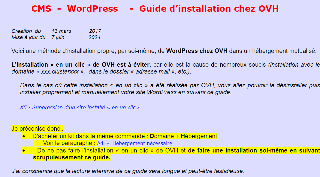 Voir --> **https://wordetweb.com/word-et-web/WORDPRESS-guide-installation-de-WordPress-premier-domaine-chez-OVH-FR.htm">CMS - WordPress - Guide Installation chez OVH**